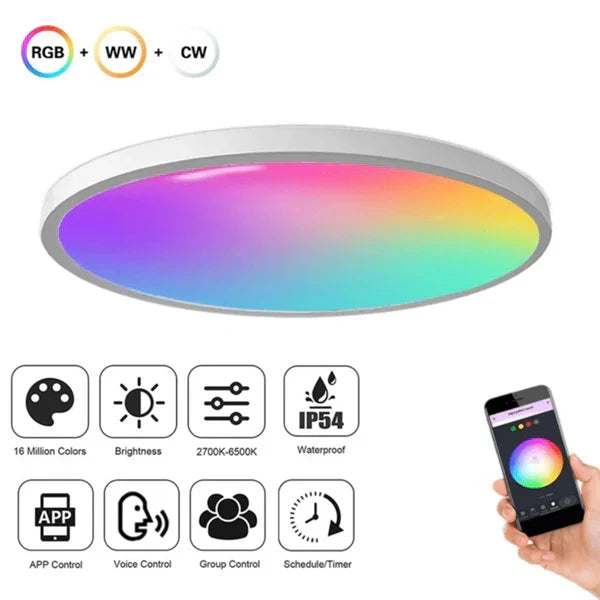 Pametna LED plafonjera sa daljinskim upravljačem Pametna LED plafonjera nudi prilagodljivost svetlosti putem aplikacije i daljinskog upravljača. Pruža širok spektar boja i intenziteta svetla. Tip: LED modul, Boja svetlosti: 2700K do 6500K + RGB Povezivanje sa pametnim telefonom preko aplikacije Tuya IP54 standard za zaštitu od prašine i vode