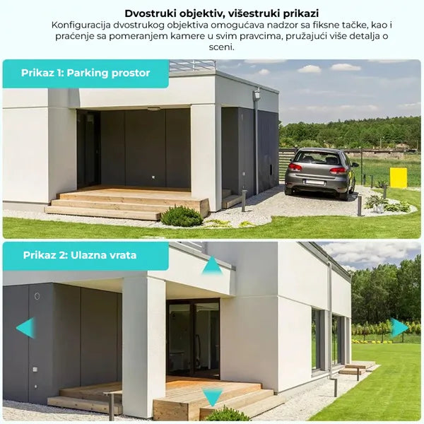 Ova WiFi sigurnosna kamera sa dva sočiva pruža UltraHD rezoluciju i naprednu AI detekciju. Opremljena dvostrukim sistemom kamera, omogućava istovremeno snimanje različitih pozicija.