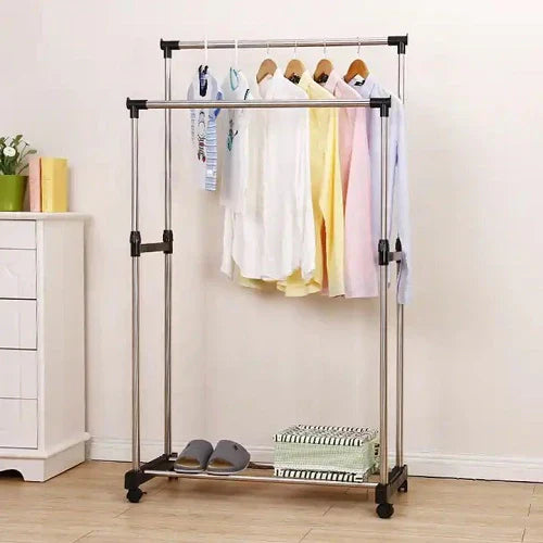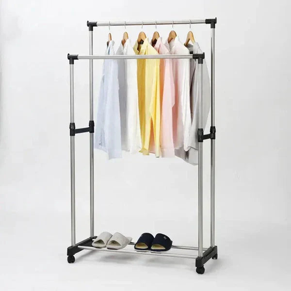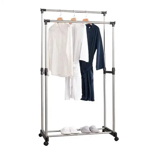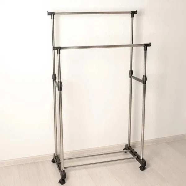 Ovaj model sa dvostrukim šipkama i točkićima omogućava fleksibilno skladištenje i lako premještanje odeće. Idealan je za dom, butik ili kancelariju.